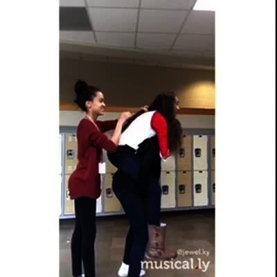 A teen girl jumps on her friend's back while her friend is already on a third girl's back. The girl in the middle falls to the floor on her back.