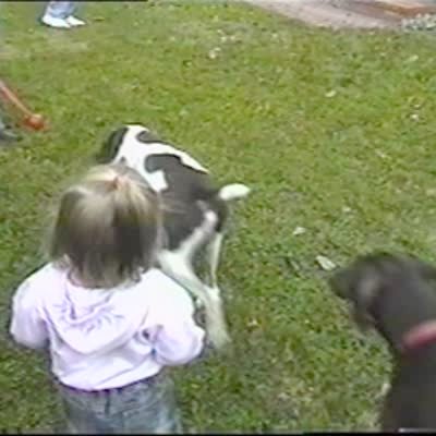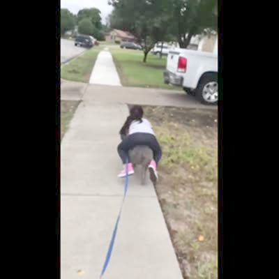 A young girl gets on the back of a pet pig who then runs fast along the sidewalk and the girl rides and hangs on.