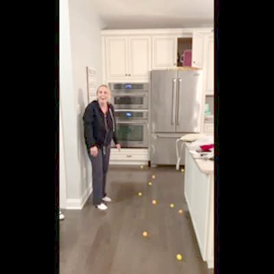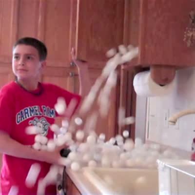 Young, teen boy opens kitchen cabinet and 400 ping pong balls come pouring out.