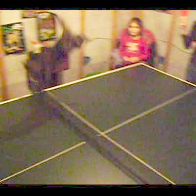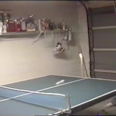 A teen boy and a man volley on a ping pong table in the garage. The boy spikes the ping bong ball and the man steps backward and stumbles over a bicycle and falls in the driveway. Security footage.