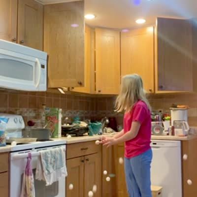 A young girl opens a kitchen cabinet and ping pong balls fall out. She laughs and her family laughs.