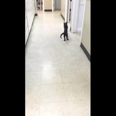 A kitten cat chases a ping pong ball down a hallway and jumps each time the ball bounces.