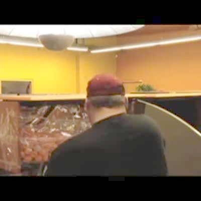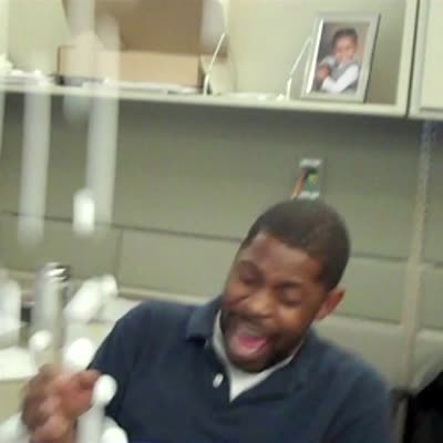 A pregnant woman opens a cabinet in an office cubicle and hundreds of ping pong balls fall out at 1:47 and scare her. She laughs and says "That almost scared the baby out of me" at 2:06.