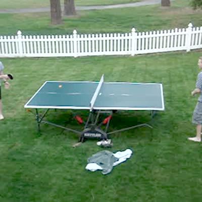 Woman hits ping pong ball at man's shirtless back, hits other man in the groin while he's trying to take a picture. Crotch.