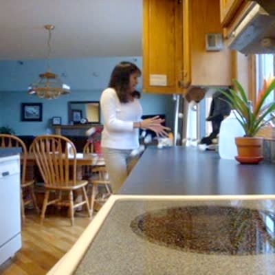 Man asks woman to make him coffee, she opens cabinet door & many ping pong balls fly out of the cupboard. Practical joke. surprise, hidden camera. April Fool's Day.