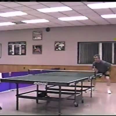 Two men play ping pong at an arcade, and when one man leans on the table to hit the ball it collapses beneath him.