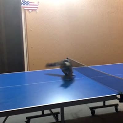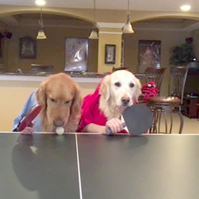 Two dogs with human hands play ping pong and one of the dogs catch the ball with its mouth indoors. AA: Dogs with human hands.