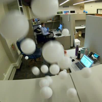 A man pours a box of ping pong balls into a woman's office cubicle as she works and she looks surprised and laughs.