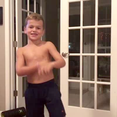 A young boy shows us an innovative dance move that incorporates the arm pit fart and the floss.
