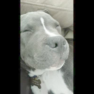 Brown bull terrier dog on couch makes strange growling/squealing noise.