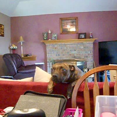 A woman says "you are very sleepy" to a pit bull dog in a living room, and the dog turns around to stare at her.