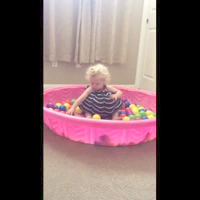 A teen girl climbs into a ball container in a store and pushes the balls out when she falls to the bottom. Snapchat caption: "When you lose a bet."
