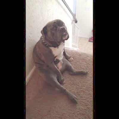A pit bull dog sits on its butt like a person and stares at a man while he says "You can't sit like that. You're not human."