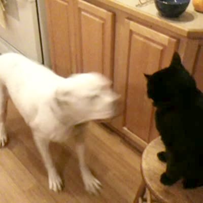 White pit bull dog jumps around a black cat on a kitchen stool, cat calmly watches then hits the dog in the face with its paw.