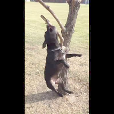 A pit bull dog growls/ screams while dangling from a tree branch by its teeth outdoors. What's that sound?