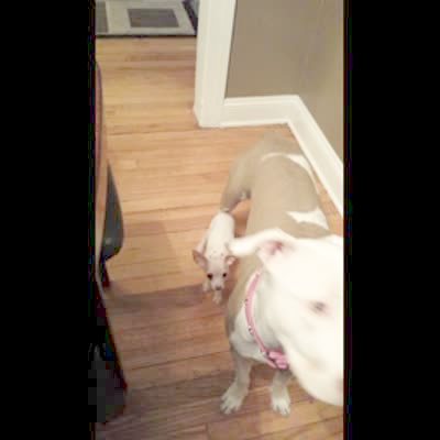 A pit bull puppy dog bites a young girl's butt then does not let go when she stands up and walks around the living room.