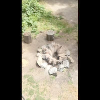 A boy throws a water balloon off a porch in slow motion. It explodes in a fire pit and shoots soot and ash up in the air. AA: water balloons in super slo-mo.