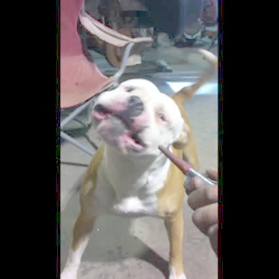 A man says "got your nose" to a pit bull dog in a kitchen, and the dog barks at him, but then she stops barking when the man says that he gave the nose back.