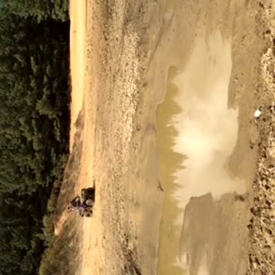 Two men flip / fall off the front of their ATV when they drive the four wheeler into a large mud pit and it gets stuck.