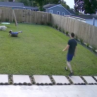 A Pit Bull walks in front of a man. The man trips over the dog and kicks his slipper towards the camera in the front yard. Security footage.