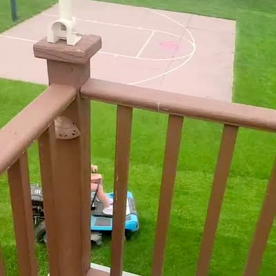 A woman mows the backyard lawn on a ridining lawnmower. The mower catches the stone fire pit and breaks it as she drives by.