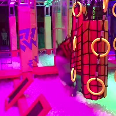 A man in an indoor obstacle course climbs onto a hanging net but the net breaks and he falls onto his young son underneath him.