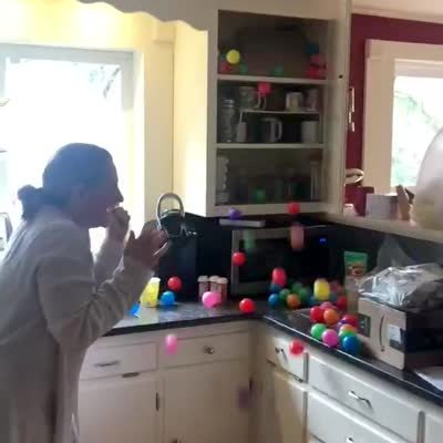 A woman opens a cabinet in the kitchen. The cabinet is full of toy balls and they all fall out on her when she opens it. April Fools
