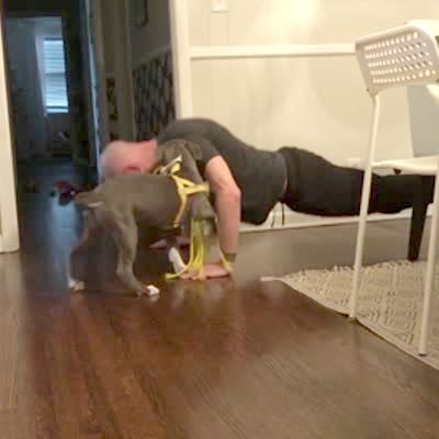 A pitbull puppy dogs repeatedly walks over a man's head while he does push-ups in the dining room.