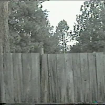Dog keeps jumping up from behind wooden fence. All you see is the dog's head popping into view. Silly pet tricks. Outdoors, backyard.