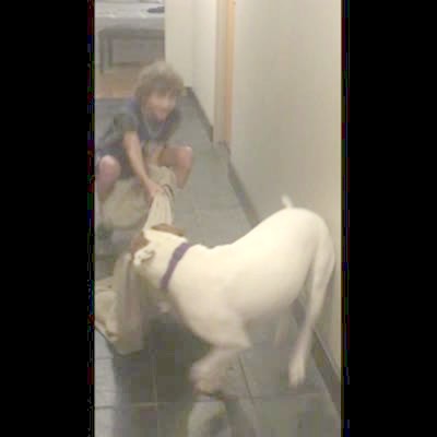 A pitbull dog pulls and drags a young boy down the hallway while he tells her to stop because he wants to do the what the fluff challenge.
