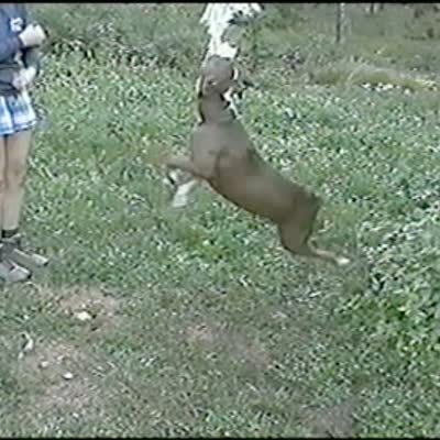 A pitbull dog tries to say 'I love you' to the camera on command.