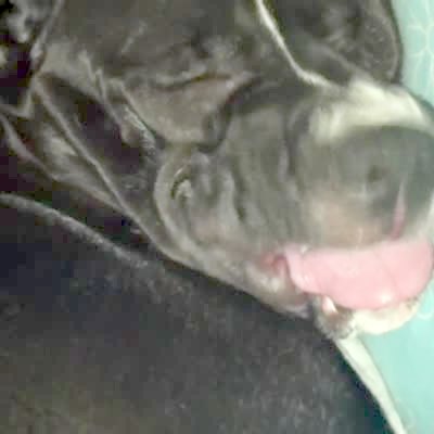 A Pitbull dog snores and makes noises.