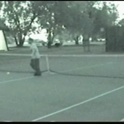 Man stands in front of automatic tennis ball pitching machine & lets the balls bounce off his head & hit his stomach. Bonehead.