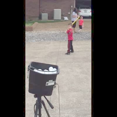 Tot boy hits baseballs from automatic pitching machine. He misses, gets mad & runs towards the camera, then gets hit by a pitched ball to the face. He falls & cries.