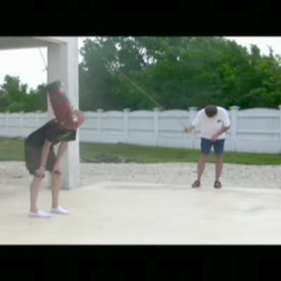 Teen girl stands behind man helping him get ready to hit pinata. He misses the pinata, hits the teen girl hard in the head with the stick. BBQ, party. Short tails.