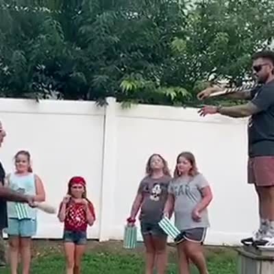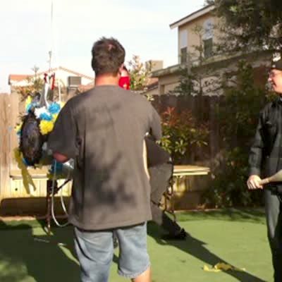 A man hits a piñata with a broom in the yard, and a young girl tells him to "put some back into it". A young boy then says "more back", and the man snaps the broom.
