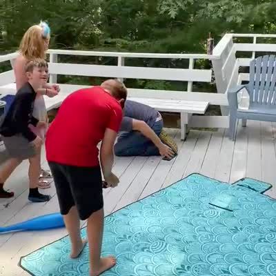 A young boy tries to hit a pi̱ata and throws the bat at a man's groin on the back deck.