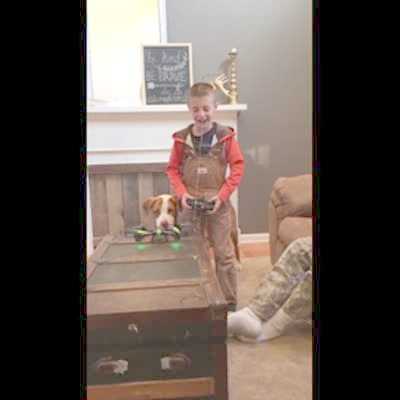 A young boy plans to use his drone to pull his loose tooth but his dog grabs the drone and runs away pulling the tooth.
