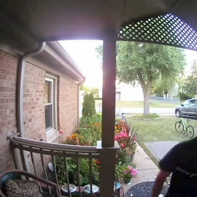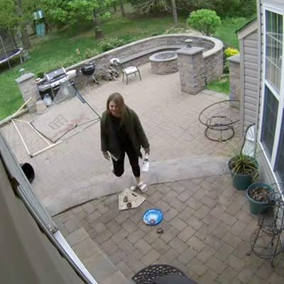 A woman backs out of her house with two plates of fruit in her hand but she trips, falls, and the plates break. Security Footage.