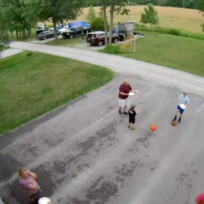 A man shoots a basketball into a hoop and it knocks a young boy's plate of cake out of his hand, then the man catches it immediately in a driveway. Security camera footage.