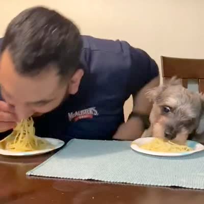 A man and dog at a dining table compete in a spaghetti eating contest and the dog finishes its plate first then eats the man's spaghetti.