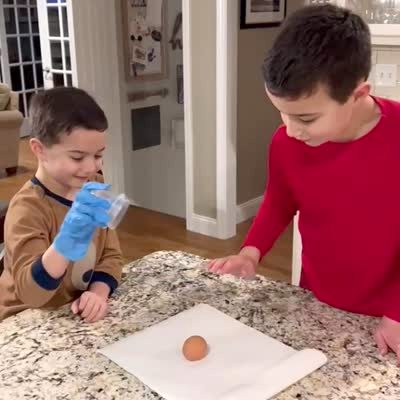 Two young boys sit at a kitchen counter and pound on a plastic container with an egg underneath.