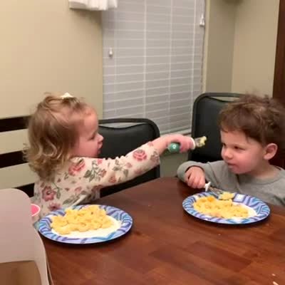 A tot girl gives a tot boy food off of her plate at the kitchen table. She giggles then falls out of her chair.