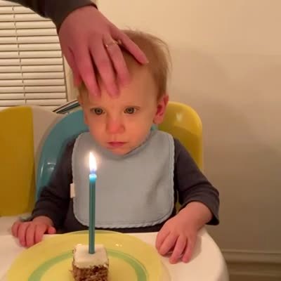 An upset young girl pushes a birthday cake off her high chair tray twice and a woman catches it on a plate both times.
