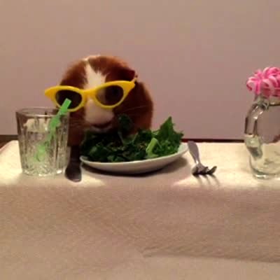A guinea pig wearing sunglasses eats lettuce off of a small plate at a small table. There is also tiny silverware, a tiny glass of water and a tiny vase.
