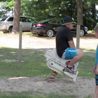 A man climbs on playground equipment and falls. He lands on his chest on a slide and bounces off. Short tail.
