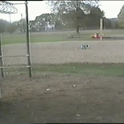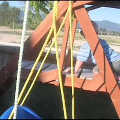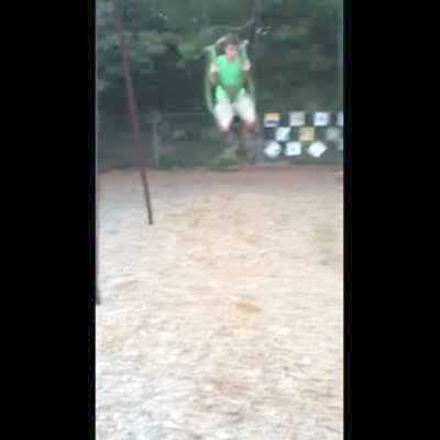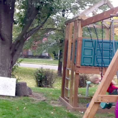 Two girls swing on backyard swingset, the whole thing falls apart and comes crashing down around them. With recovery. OC voice says "well I guess it's time to get rid of that"