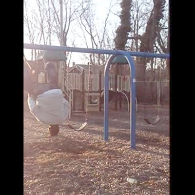 A teen boy rides in a baby swing on a playground that buckles him into the seat and another boy pushes him. At 0:30, the belt that straps him into the swing breaks off and he falls on the ground.