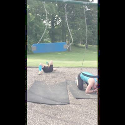 Two women stand behind a swing set to do a burpee exercise at a playground outdoors. They push the swings and one woman jumps down and ducks under it and lifts her head up and gets hit by the swing when it comes back. The other woman doesn't move after she pushes the swing and it comes back and hits her in the face and she falls down.