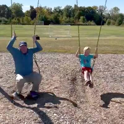 A man and a young boy swing on a swing set at a playground. The mans swing breaks on his way back down and he falls on his butt.